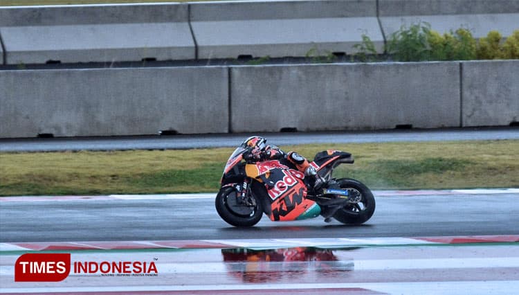 TIMES Bondowoso/Pembalap tim Red Bull KTM, Miguel Oliveira melahap trek basah Sirkuit Mandalika, saat lomba seri kedua MotoGP di Mandalika, Lombok, NTB, Minggu (20/3/2022). (FOTO: Tria Adha/TIMES Indonesia)