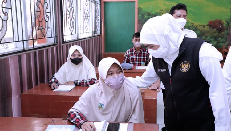 TIMES Bondowoso/Gubernur Khofifah saat meninjau PTM terbatas. (FOTO: Dok.Humas Pemprov Jatim)