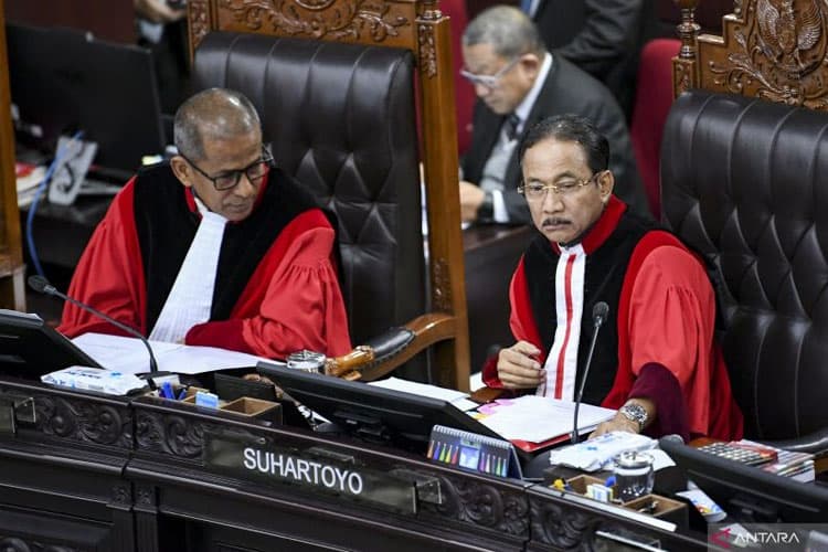 TIMES Bondowoso/Ketua Mahkamah Konstitusi (MK) Suhartoyo (kanan) bersama Wakil Ketua MK Saldi Isra memimpin sidang pengucapan putusan perkara dilanjutkan atau tidak (dismissal) sengketa Pilkada 2024 di Gedung Mahkamah Konstitusi, Jakarta, Rabu (5/2/2025). (ANTARA)